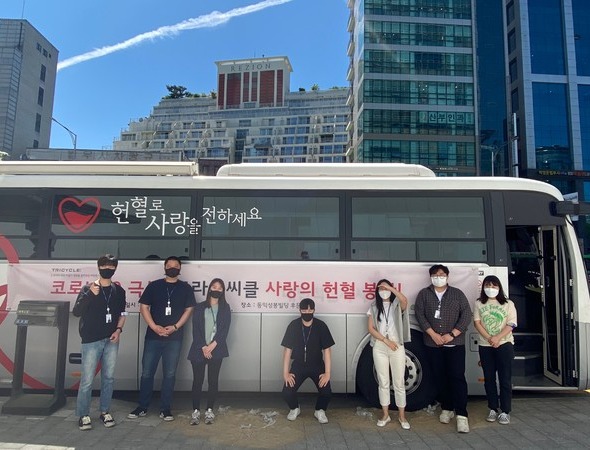 서울 서초구에 위치한 트라이씨클 본사를 방문한 대한적십자사 헌혈버스에서 서비스마케팅본부 김도운 상무를 비롯한 자발적 참여의사를 밝힌 임직원들이 봉사활동에 동참했다.