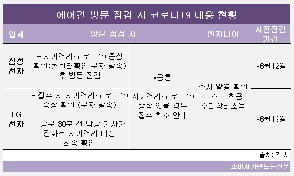 삼성전자서비스센터와 LG전자는 에어컨 방문점검 전 ‘코로나19’ 자가격리자 여부를 확인하고 있다. 삼성전자서비스는 AS접수 시 자가격리자 대상인지 고객에게 먼저 확인한 뒤 방문 접수를 결정한다.