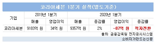 금융감독원 전자공시시스템에 따르면 코리아세븐(대표 최경호) 올 1분기 매출은 9357억 원으로 2% 증가하는 데 그쳤다. 영업수지는 지난해 1분기 34억 원 흑자에서 올해 1분기 87억 원 적자로 돌아섰다.