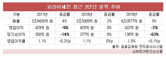 지난 2017년 영업이익은 전년 동기 대비 9% 감소한 429억 원을 기록한 후, 2018년 429억 원으로 제자리걸음을 했다가 지난해 다시 422억 원으로 줄었다. 지난해의 경우 당기순이익이 무려 63%나 감소하기도 했다.