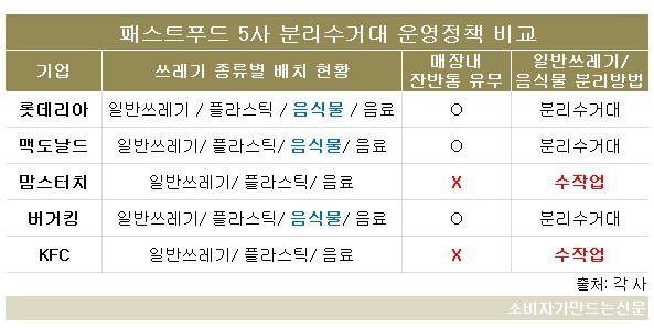 롯데리아‧맥도날드‧버거킹 3사는 전 매장 분리수거대에 ‘음식물’이라는 공간을 마련해 분리배출이 가능하도록 운영중인 반면 맘스터치‧KFC는 매장내에 잔반통을 두지 않고 일괄 폐기하는 형태다.