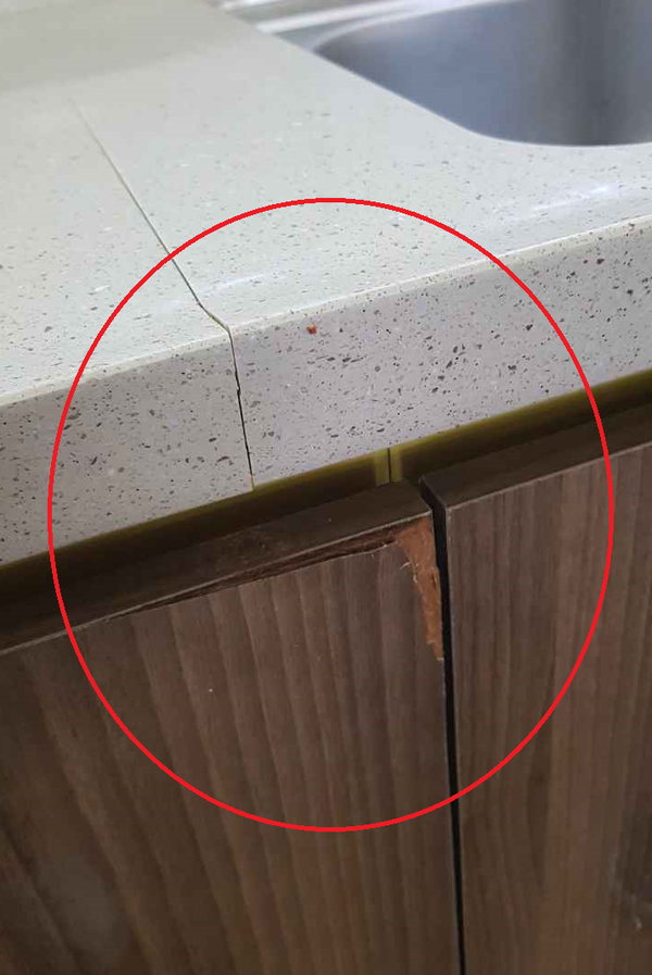 5년 전 박 씨는 싱크대 상판의 높낮이가 달라 갈라진 현상을 발견하고 수리를 요구했다. 하지만 수리기사는 이상이 없다며 계속 사용하기를 권유했고 결국 갈라진 틈새에 스며든 물로 수납장 문이 부풀게 됐다.