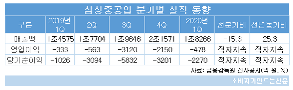 금융감독원 전자공시에 따르면 삼성중공업은 올해 1분기에도 적자를 내면서 10분기 연속 영업손실을 기록했다. 삼성중공업의 올해 1분기 매출은 1조8266억 원으로 지난해 같은 기간보다 25.3% 증가했지만 478억 원의 영업손실을 냈다. 지난 2016년부터 올해 1분기까지 영업손실 규모가 1조7451억 원에 이른다.