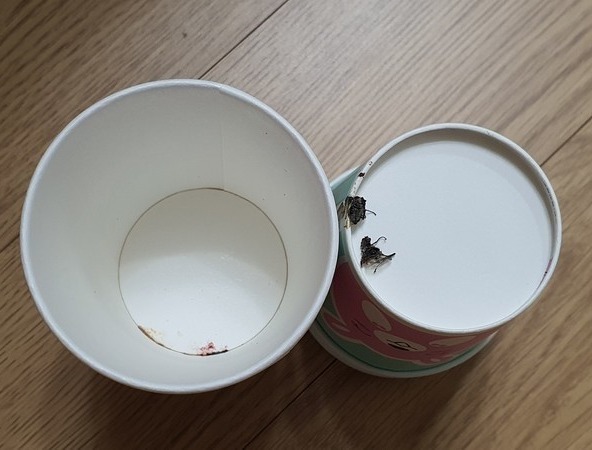 경기 화성시에 거주하는 최 모(남)씨는 생활용품점에서 구입한 종이컵을 사용하려다 기겁했다. 종이컵에 죽은 파리가 2마리나 들어있었기 때문. 심지어 벌레의 피까지 종이컵 안쪽에 묻어 있었다고.
