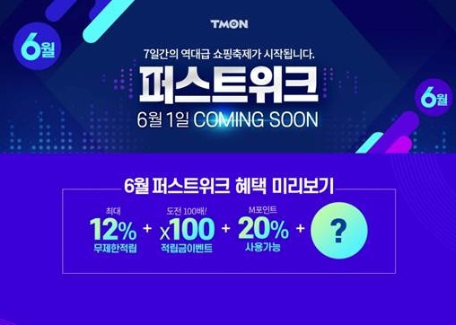 티몬은 이날 6월 퍼스트위크 기간의 적립 혜택을 사전 공개했다. 먼저 행사 기간의 제품 구매 건 마다 구매액의 최대 12%가 무제한 적립된다.