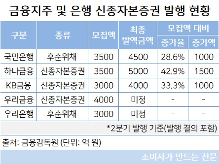 하나금융(회장 김정태)도 3500억 원 규모 신종자본증권 발행을 추진하기 위해 이달 19일 진행한 수요예측에서 모집액 대비 2.3배 많은 8150억 원의 유효수요가 몰렸다. 이에 하나금융은 최종 발행액을 5000억 원으로 증액했다.