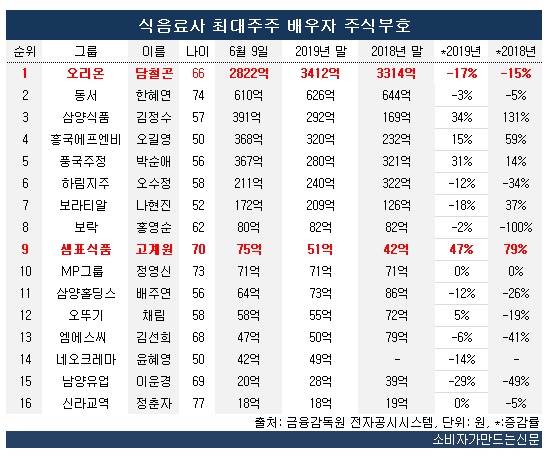 소비자가 만드는 신문이 50대 식품 상장기업 최대주주 직계 일가를 조사한 결과, 기업 지분을 보유한 오너의 배우자는 총 31명이다. 6월 9일 종가 기준 31인의 지분가치는 총 5568억 원으로 지난해 말 6015억 원보다 7% 줄어들었다.
