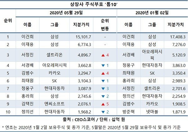 또 코로나19 진단키트와 치료제 관련주로 화제가 된 씨젠의 천종윤 대표와 서정진 셀트리온 회장 등 바이오 기업 오너 일가의 주식부호 순위 상승도 눈에 띄었다.