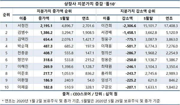 5개월 새 지분가치가 가장 많이 증가한 부호는 서정진 회장으로 2조7016억 원에서 4조8967억 원으로 2조1951억 원(81.3%) 증가했고, 순위도 4계단 올라 3위가 됐다. 같은 기간 김범수 의장은 1조3862억 원(72.6%) 늘어 순위가 9위에서 5위로 올라섰다,