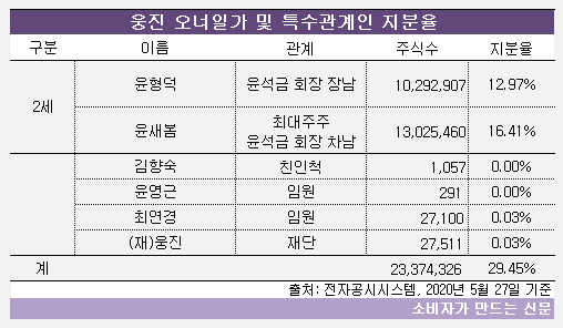 웅진은 오너일가 및 특수관계인 지분율이 29.45%인데 그 중 대부분을 윤형덕, 윤새봄 형제가 나눠 갖고 있다. 이 같은 상황에서 형제간 지분율이 역전되면서 차남인 윤새봄 대표가 후계구도에서 유리한 입지를 점한 것 아니냐는 해석도 제기된다.