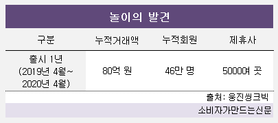 출시 1년(2020년 4월 기준)만에 놀이의 발견 누적 거래액은 80억 원, 누적 회원 46만 명, 제휴사는 5000여 곳을 돌파한 것이다.