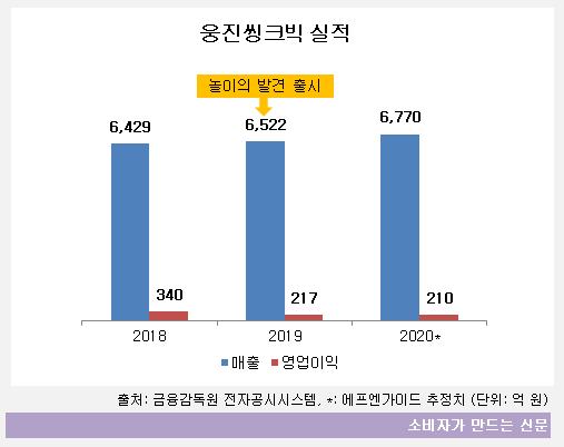 에프엔가이드 전망치에 따르면 웅진씽크빅 2020년 매출 추정치는 6770억 원으로 전년 대비 200억 원 가량 늘어난 수치다. 1위 업체 대교의 매출 전망치가 약 400억 원 감소한 7199억 원인 것과 대조되는 모습이다.