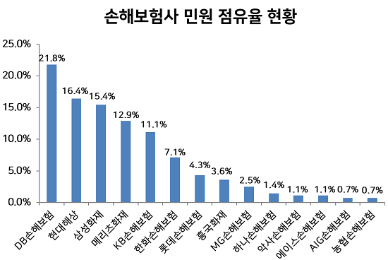 계약건수가 두 번째로 많은 DB손해보험(점유율 16.5%)은 민원 점유율은 역시 21.8%(1위)를 기록하며 규모 대비 민원이 비례하는 결과를 보였다. 업계 6~7위인 한화손보(844만 건), 흥국화재(447만 건), 롯데손해보험(353만 건)은 민원 점유율에서도 각각 6위(7.1%), 8위(3.6%), 7위(4.3%)로 비슷한 결과를 보였다.