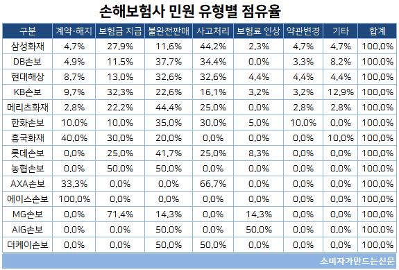 사고처리 민원은 자동차보험 비중이 높은 AXA손보에서 비중이 66.7%에 달했고 하나손보(구.더케이손보 50%)와 삼성화재(44.2%)도 가장 높은 비중을 차지했다.