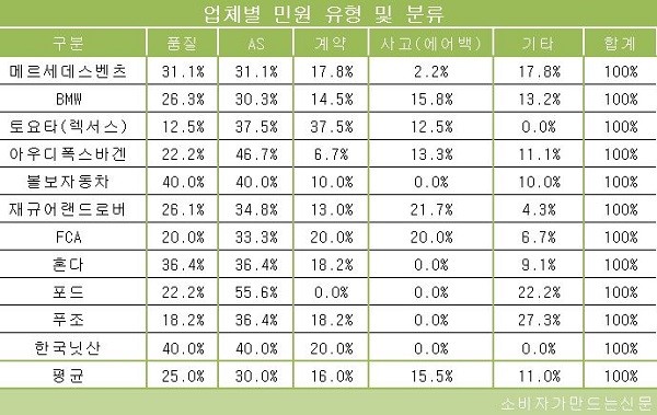 지난해 메르세데스벤츠, BMW, 아우디폭스바겐, 볼보자동차, 푸조, 한국닛산, 토요타(렉서스), 혼다, 재규어랜드로버, FCA, 포드 등 국내 수입차 업체 11곳을 대상으로 소비자들이 가장 많은 불만을 제기한 문제는 ‘AS’ 로 36.2%에 달했다. 이어 '품질' 불만이 26.9%였다. 이어 ▲계약 ▲기타 ▲사고(에어백) 민원이 뒤를 이었다.