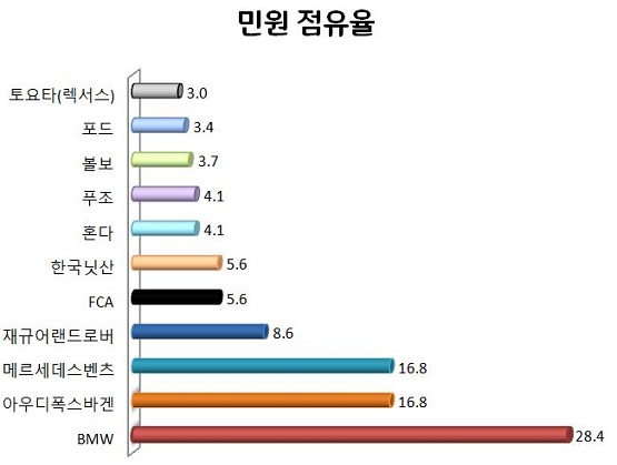 반면 아우디폭스바겐은 지난해 시장점유율 8.4%로 낮았음에도 민원점유율은 상대적으로 높았다. 나머지 업체들의 민원 점유율은 10% 미만이었다. 그 중에서도 토요타는 렉서스와 합쳐 시장 점유율이 9.5%에 달했지만 민원점유율은 3.0%에 불과해 2020 소비자 민원 평가 대상을 차지했 다.