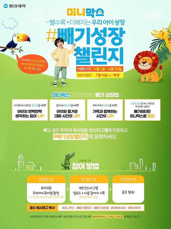 동아제약 관계자는 “아이들의 건강과 성장을 위해서는 과도한 더함 보다는 빼는 것이 곧 더함이 될 수 있다”며 “미니막스 정글 빼기 성장 챌린지에 엄마들의 많은 참여를 바란다”고 말했다.