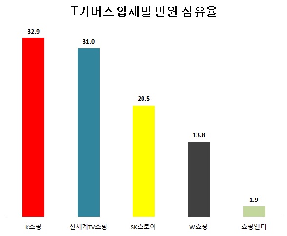 국내 T커머스 5사 중 민원점유율이 가장 높은 곳은 K쇼핑으로 32.9% 비중을 기록했다. 이어 신세계TV쇼핑(31%)이 간소한 차이로 2위를 기록했다.