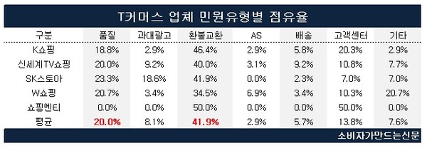 직접 보고 구입하지 못하는 T커머스 특성상 구매한 상품 등이 광고와는 전혀 다른 모습이라던가 부실하다는 등 제품하자 불만이 다발했다. 품질 관련 민원이 전체의 20%에 달했다.