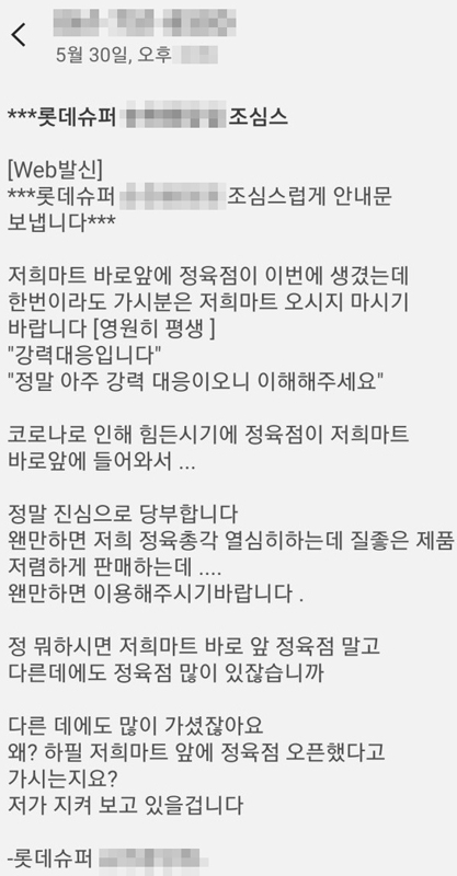 문자 메시지에는 '저희 마트 바로 앞에 정육점이 이번에 생겼는데 한 번이라도 가신 분은 저희 마트 오시지 마시기 바랍니다[영원히 평생]'라는 협박성 내용이 담겼다.