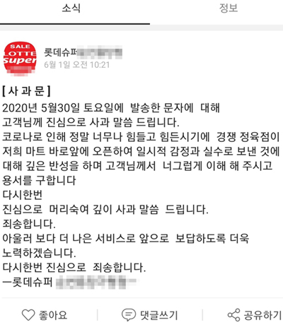 메시지를 발송한 이틀 뒤 지점장은 카카오톡을 통해 '코로나로 인해 힘든 시기에 경쟁 정육점이 바로 마트 앞에 오픈해 일시적 감정과 실수로 보냈다'며 사과의 뜻을 밝혔다.