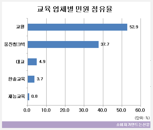 1000억 원대 매출을 올리는 한솔교육(1731억 원)과 재능교육(1648억 원)은 실적이 낮은 만큼 민원점유율도 4, 5위를 차지했다.