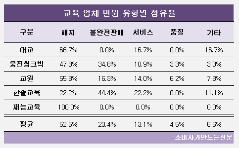 교육 부문 소비자 민원은 ‘계약해지’와 ‘불완전판매’에 집중됐다. 두 항목의 민원 점유율은 75.9%로 높다.