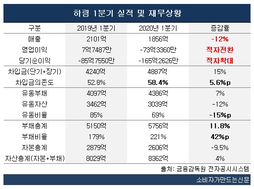 올 1분기에 매출 감소로 영업이익이 적자전환 됨과 동시에 부채비율, 차입금의존도가 크게 상승하는 등 위기가 고조되고 있다.