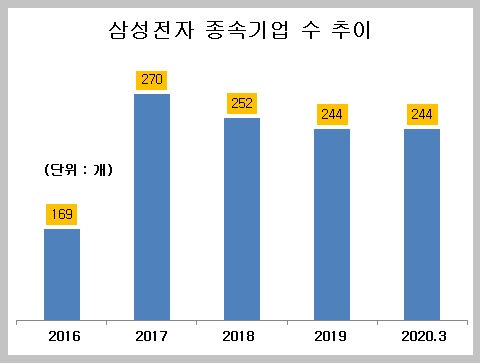 금융감독원 전자공시시스템에 따르면 3월 말 기준 삼성전자의 종속기업 수는 244개로 집계됐다. 2017년 270개에서 2018년 252개, 지난해 244개로 지속적인 감소세를 보이고 있다.