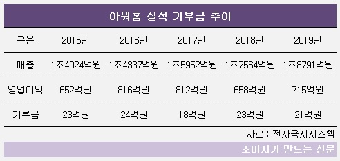 오너 일가가 챙겨가는 배당금이 크게 증가하고 있는 반면, 기부금은 일정 수준에 머물고 있다. 아워홈은 지난 5년 동안 매년 평균 21억6000만 원을 기부금으로 썼다. 매출 대비 기부금 비중은 0.1%로 대기업 평균 수준이다.