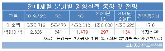 현대제철은 지난해 4분기 1479억 원의 영업손실을 내며 창사 첫 적자를 냈다. 1분기에도 297억 원의 영업손실을 냈고, 2분기 역시 적자가 예상된다. 코로나 사태에 따른 전방 산업 수요 부진과 중국 등 해외 종속법인의 영업 회복 지연에 따라 3분기 연속 적자를 피하기 어려워보이는 상황이다.