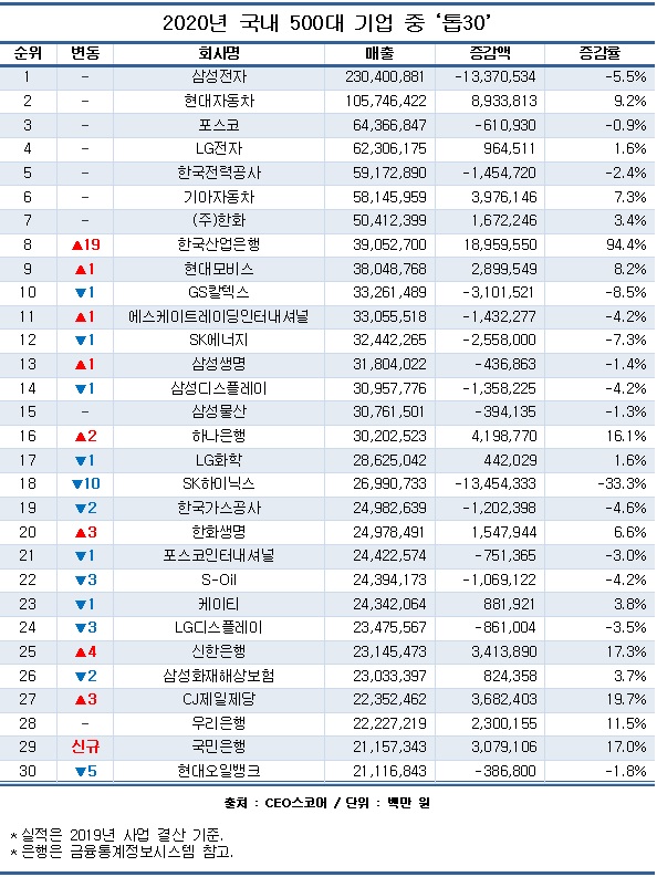 1위부터 7위는 전년과 순위 변동이 없었다. 8위 한국산업은행이 20조932억 원(27위)에서 39조527억 원으로 영업수익이 급증하며 단숨에 10위권에 진입했다. 10위권에 신규 진입한 곳은 한국산업은행이 유일했다. 현대모비스(9위)와 GS칼텍스(10위)가 서로 자리를 맞바꿨다.