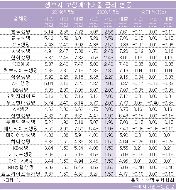 생보사 관계자는 “금감원 주문에 따라 기존 보험계약대출을 받은 고객도 별도의 신청 없이 개선된 가산금리를 적용할 방침”이라며 "기준금리 인하로 지난해 말부터 올해 초 대출금리를 인하한 보험사가 많아 조정폭은 내부 사정에 따라 다를 것"이라고 설명했다.