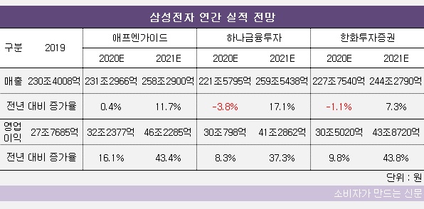 에프앤가이드와 하나금융투자는 삼성전자가 2021년 260조 원에 육박하는 매출을 올릴 것으로 본다. 한화투자증권은 244조3000억 원으로 상대적으로 낮게 전망하고 있는데, 이 역시 달성된다면 사상 최대 매출이다.