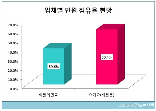 2019년 한 해 동안 소비자고발센터(www.goso.co.kr)에 제기된 국내 양대 배달 어플리케이션 배달의민족과 요기요(배달통)에 대해 소비자 민원을 집계한 결과 요기요(배달통)의 민원 점유율이 60.4%로 배달의 민족을 앞질렀다. 배달의민족 민원 점유율은 39.6%에 그쳤다.