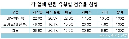 서비스 민원은 다양한 문제로 고객센터로 도움을 청할 때 구제를 받지 못하면서 발생했다. 소비자들은 업체 측에 적극적인 해결을 요구하지만 배달앱은 플랫폼으로서 중재 역할에 불과한 해법만 제시해 불만을 샀다.