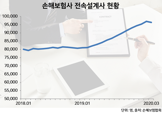 손해보험협회에 따르면 올해 3월 말 기준 종합 손해보험사 10곳의 전속 설계사 수는 전년 대비 17.3% 증가한 9만6425명으로 집계됐다. 코로나19 여파가 이어지고 있지만 지난해 상반기부터 줄곧 증가 추세였다는 점을 감안하면 올해 말까지 전속 설계사 10만 명 돌파가 유력하다.