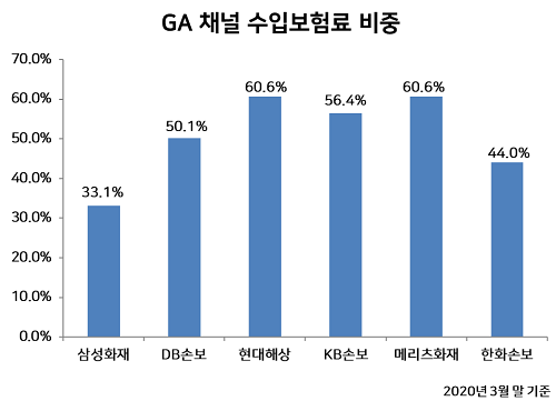 삼성화재를 제외하면 현재 주요 손보사의 수입보험료 절반 이상은 GA 채널에서 나오고 있다. 올해 3월 말 기준 메리츠화재와 현대해상(대표 조용일·이성재)은 GA 채널 수입보험료 비중이 60.6%에 달했고 KB손해보험(56.4%)과 DB손해보험(50.1%)도 절반 이상이 GA 채널에서 발생했다. 반면 설계사 조직이 탄탄한 삼성화재는 33.1%를 기록해 상대적으로 낮았다. 손보사들이 GA 채널을 무시할 수 없는 이유다.