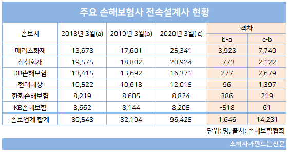 메리츠화재 뿐만 아니라 다른 손보사들도 전속 설계사를 지속 늘리고 있다. 삼성화재는 지난 3월 말 기준 전속 설계사 수가 전년 대비 11.3% 증가한 2만924명, DB손해보험도 같은 기간 전속 설계사가 2679명 증가해 1만6371명에 달했다.