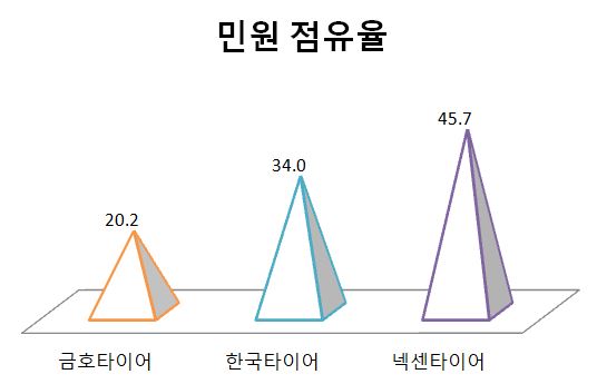 매출 2조 223억원으로 업계 3위인 넥센타이어는 민원점유율이 1위(45.7%)를 기록해 민원관리가 좀 더 개선돼야 할 것으로 지적됐다.