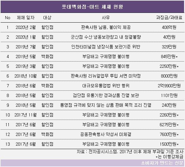 롯데백화점과 마트가 받은 제재는 2017년 3건, 2018년 4건, 2019년 3건, 올 들어서는 3월까지 2건이다.