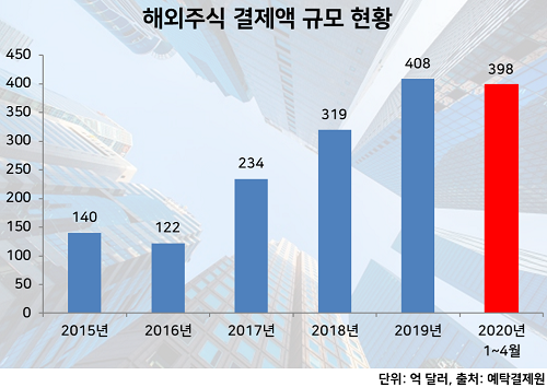 한국예탁결제원에 따르면 해외주식결제액 규모는 지난 2016년 122억 달러를 저점으로 매년 급속도로 증가하고 있다. 무엇보다 올해 1월부터 4월까지 해외주식결제액 규모는 398억 달러로 이미 지난해 전체 결제규모(408억 달러)에 근접할 정도로 급성장세다.
