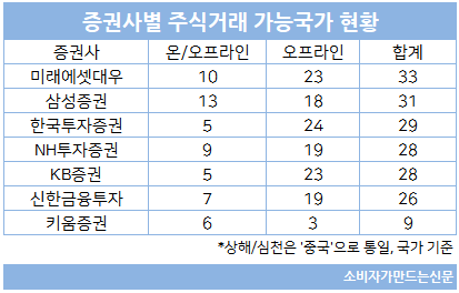 현재 국내 증권사 중에서 온·오프라인 매체를 통해 가장 많은 국가와 주식거래가 가능한 증권사는 미래에셋대우다. 미래에셋대우는 현재 총 33개국 시장의 주식 거래가 가능한데 HTS와 MTS와 같은 온라인 매체로는 미국, 중국A(후강퉁·선강퉁), 홍콩 등 10개국 주식 거래를 제공한다.