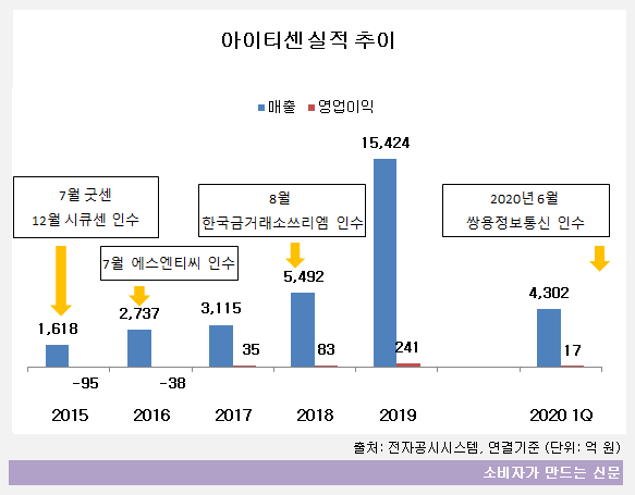 아이티센은 2015년부터 M&A틑 통해 빠르게 외형을 키우는 데 성공했다. 지난해 매출은 1조5424억 원으로 2015년에 비해 9.5배 규모로 성장했다. 특히 2018년 8월 한국금거래소쓰리엠을 인수하면서 1년만에 매출이 1조 원이나 늘었다.