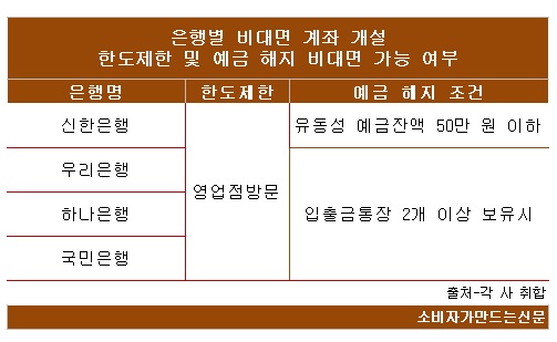 비대면 계좌 개설을 희망할 경우 신분증과 핸드폰을 이용한 영상통화 등으로 간편한 실명인증 후 계좌 개설이 손쉽게 이루어지지만 한도 제한 해지와 계좌 해지 등의 처리는 취약하다는 불편이 따르고 있다.