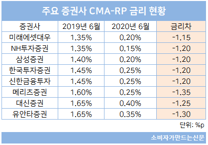 증권사 CMA 금리는 줄곧 하향 곡선을 그리고 있다. 잔고가 가장 많은 RP형 CMA를 기준으로 현재 증권사별 수익률은 0.15~0.4%내에 형성돼있는데 이는 전년 대비 1.15~1.30% 포인트 가량 떨어졌다. 1년 새 금리가 5분의 1 수준으로 급락한 셈이다.