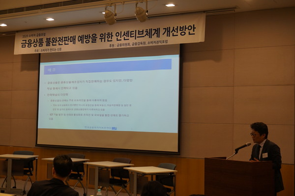 한국금융투자자보호재단 윤민섭 금융소비자연구센터 연구위원은 23일 오후 서울 여의도 전경련회관 컨퍼런스센터 에메랄드홀에서 열린 ‘2020 소비자금융포럼’에서 ‘금전적 보상체계 현황과 문제점’에 대해 발표했다.