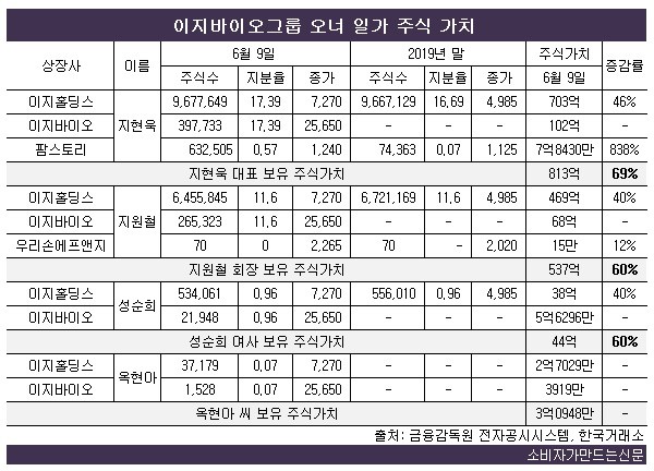 이지바이오 그룹은 지현욱 대표가 최대주주로 자리하고 있고, 부친 지원철 회장, 모친 성순희 여사, 배우자 옥현아 씨가 그룹 주식을 보유하고 있다. 지현욱 대표를 제외한 나머지는 보유 주식수가 지난해 말 대비 줄어들었음에도 불구하고 보유주식가치는 두자릿수 비율로 늘어났다.
