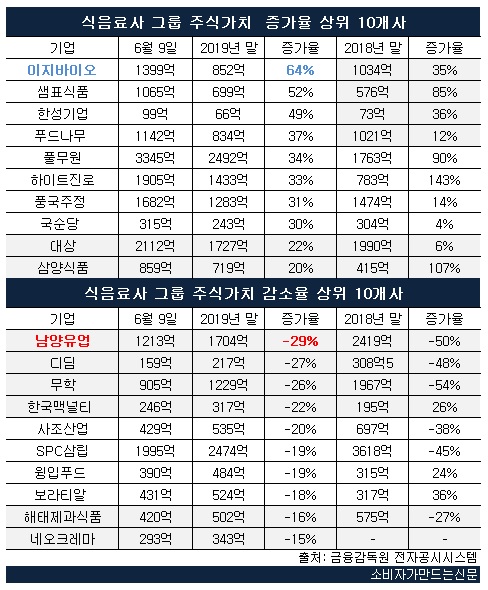 50대 식음료 상장기업 중 이지바이오그룹 오너 일가가 보유한 주식의 가치가 6개월 새 64% 증가한 반면, 남양유업 오너 일가는 29%나 감소해 대조를 이뤘다.