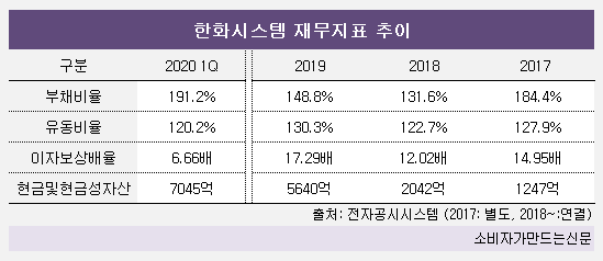 통상 부채비율은 100% 미만을 건전한 것으로 보는데 한화시스템은 기준치의 2배에 가까운 수준이다.